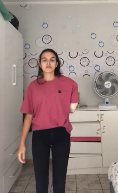 beautiful girl pretending not to have one of her arms.